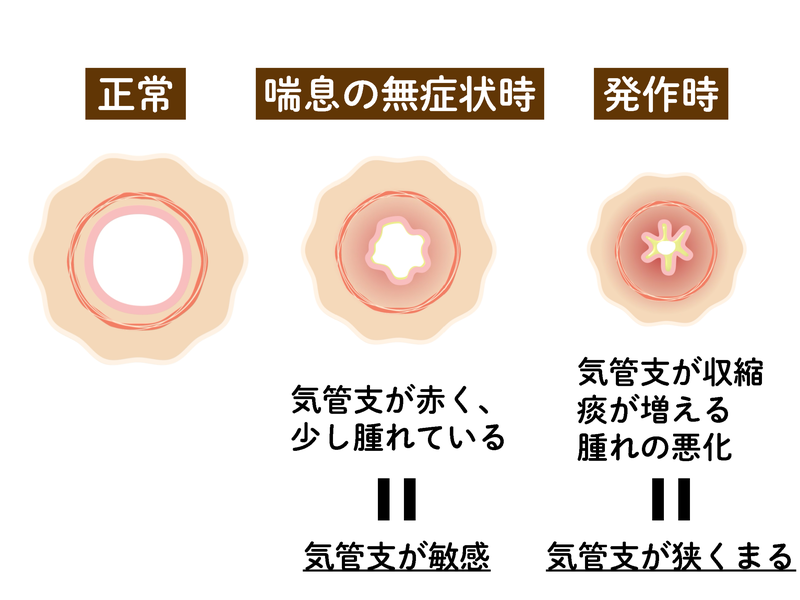 ​右(炎症): 粘膜が腫れて通り道が狭くなり、刺激に対して敏感になっています。