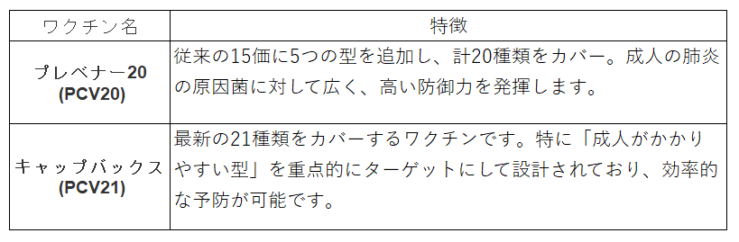 これまでは「23価(ニューモバックス)」や「15価(プレベナー15)」が中心でしたが、4月からはより高い予防効果が期待できる「沈降20価(プレベナー20)」と「沈降21価(キャップバックス)」の2種類が主な選択肢となります。