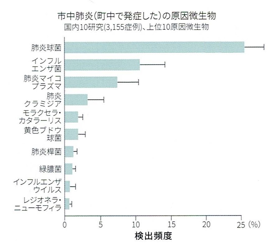 成人市中肺炎の原因微生物のうち、肺炎球菌は約25.2%を占め、2位のインフルエンザ菌(約10%)を大きく引き離して最多です。