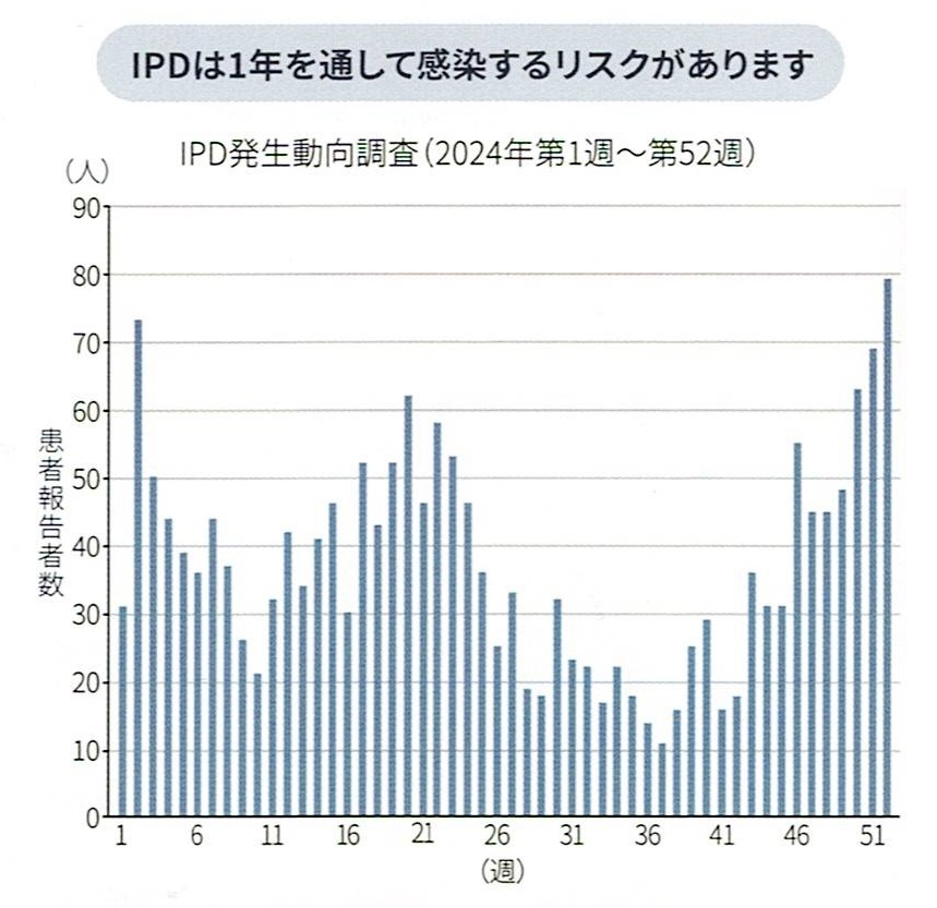 1年中続く感染リスク 肺炎球菌による重症感染症(IPD)は、インフルエンザのような季節性がなく、1年を通して発生しています。冬場だけでなく、常に備えが必要です。